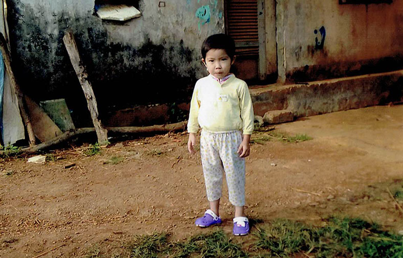 Em Gia Tuệ và cha mẹ trước ngôi nhà đang sinh sống