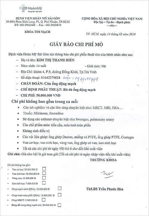 Em Hiền bị Còn ống động mạch