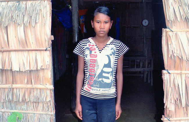 Em Thạch Thị Thênh cùng mẹ và em trai đứng trước nhà của mình