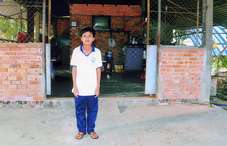 Gia đình Thuận có 4 người đang sống trong căn nhà nền xi măng, tường gạch ống chưa tô trát kết hợp với lưới sắt. Nhà em thuộc diện khó khăn, không có đất đai, không tài sản, mọi chi phí sinh hoạt đều phụ thuộc vào công việc buôn bán nhỏ của vợ chồng anh Vũ.