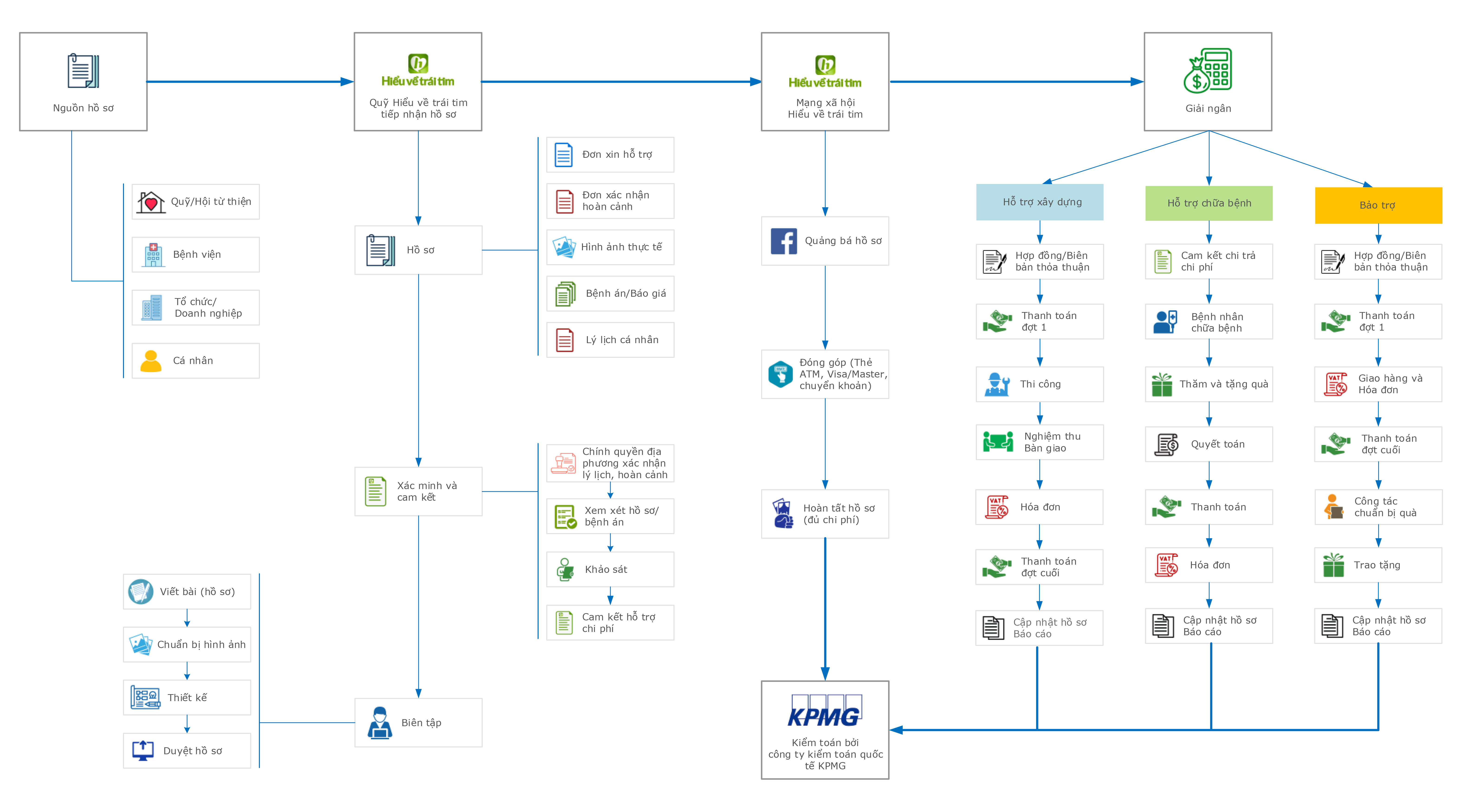 Chân thực, chính xác, rõ ràng và minh bạch là những tiêu chí hàng đầu khi Quỹ Hiểu về trái tim tiếp nhận hồ sơ từ các nguồn (bệnh viện, tổ chức, doanh nghiệp, cá nhân) để hỗ trợ những em nhỏ mắc bệnh tim bẩm sinh, hoặc những gia đình có hoàn cảnh khó khăn xây Nhà nhân ái, bảo trợ dinh dưỡng cho các cụ già neo đơn, trẻ mồ côi cơ nhỡ ... Trước khi chính thức đưa hồ sơ lên Mạng xã hội Hiểu về trái tim (hieuvetraitim.com) kêu gọi cộng đồng cùng đóng góp, chúng tôi đều phải tiến hành xác minh hoàn cảnh, lý lịch cũng như xem xét hồ sơ bệnh án của đối tượng để đảm bảo tính CHÂN THỰC và CHÍNH XÁC; rồi sau đó tùy từng trường hợp mà có cam kết hỗ trợ cụ thể. Sau khi hoàn tất kêu gọi, chúng tôi tiến hành thực hiện cam kết hỗ trợ, cố gắng nhanh nhất, sớm nhất có thể để các bệnh nhi được kịp thời cứu chữa; những gia đình khó khăn có mái nhà mới an toàn; các cụ già cũng như em nhỏ đang được nuôi dưỡng tại các trung tâm có hoàn cảnh sống tốt hơn, có thêm những bữa cơm ấm lòng. Trong quá trình thực hiện cam kết hỗ trợ, chúng tôi thường xuyên cập nhật, thông báo tình hình cũng như tiến độ trong từng hồ sơ đã kêu gọi trên Mạng xã hội Hiểu về trái tim (hieuvetraitim.com) một cách RÕ RÀNG để các nhà hảo tâm đã đóng góp có thể theo dõi và biết tiền mình đã đóng góp được sử dụng ra sao. Tất cả các nguồn thu, chi trong quá trình thực hiện cam kết hỗ trợ cho các đối tượng đều được kiểm tra bởi KPMG - một trong những đơn vị kiểm toàn hàng đầu thế giới, nên đảm bảo tính MINH BẠCH. Dưới đây là Sơ đồ Quy trình tiếp nhận và xử lý hồ sơ của Quỹ Hiểu về trái tim: Có thể xem chi tiết trong file đính kèm bên dưới